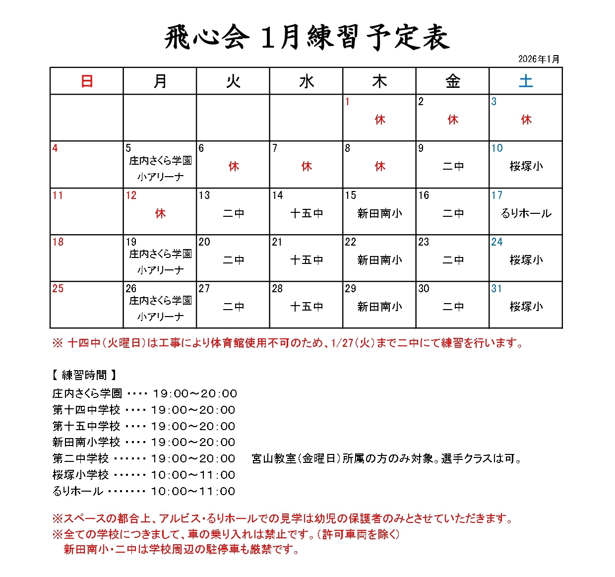 桜塚教室(桜塚小学校体育館・るりホール) 10:00~11:00 るりホールは桜塚教室所属の方のみ